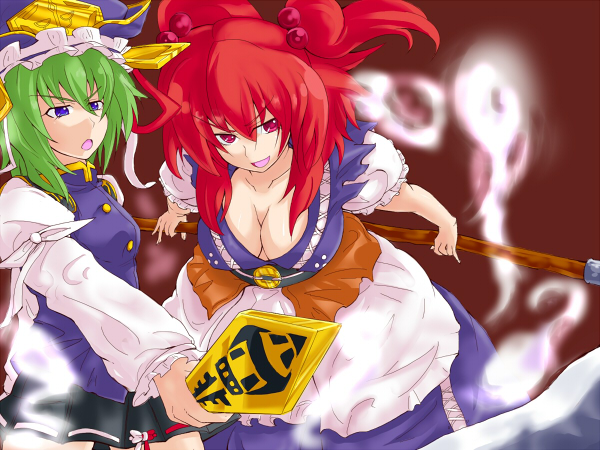 2girlsbreastsfemale focusgreen hairhatmultiple girlsred hairribbonrod of remorsescytheshort hairstanding