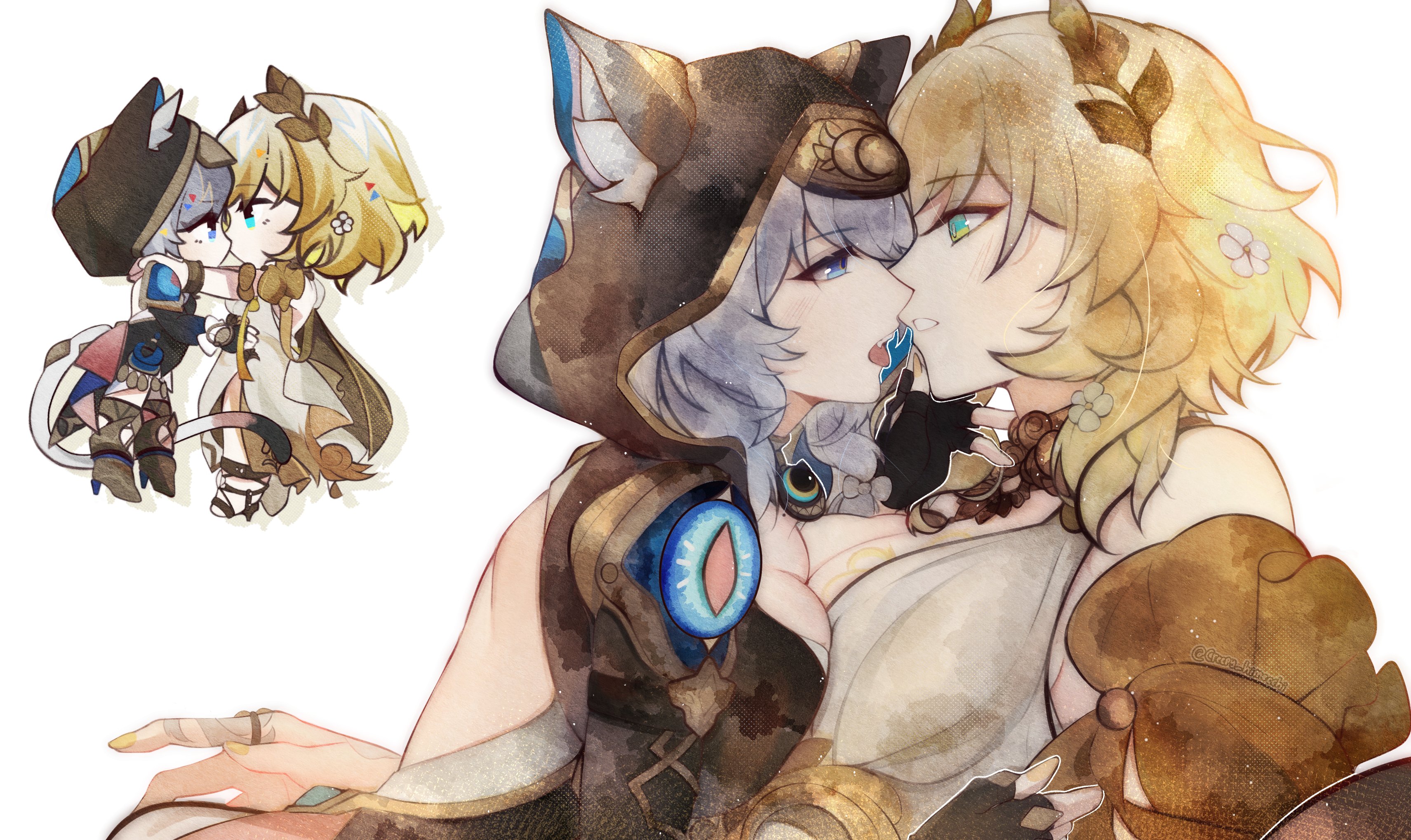 2girlsanimal earsblack glovesblonde hairblue eyesbreast pressbreastscat earscleavagedressfangfingerless glovesglovesgreen eyesgrey hairimminent kisskisslarge breastslaurel crownmedium hairmultiple girlsopen mouthparted lipssimple backgroundsymmetrical dockingtonguetongue outwhite backgroundwhite dressyellow nailsyuri