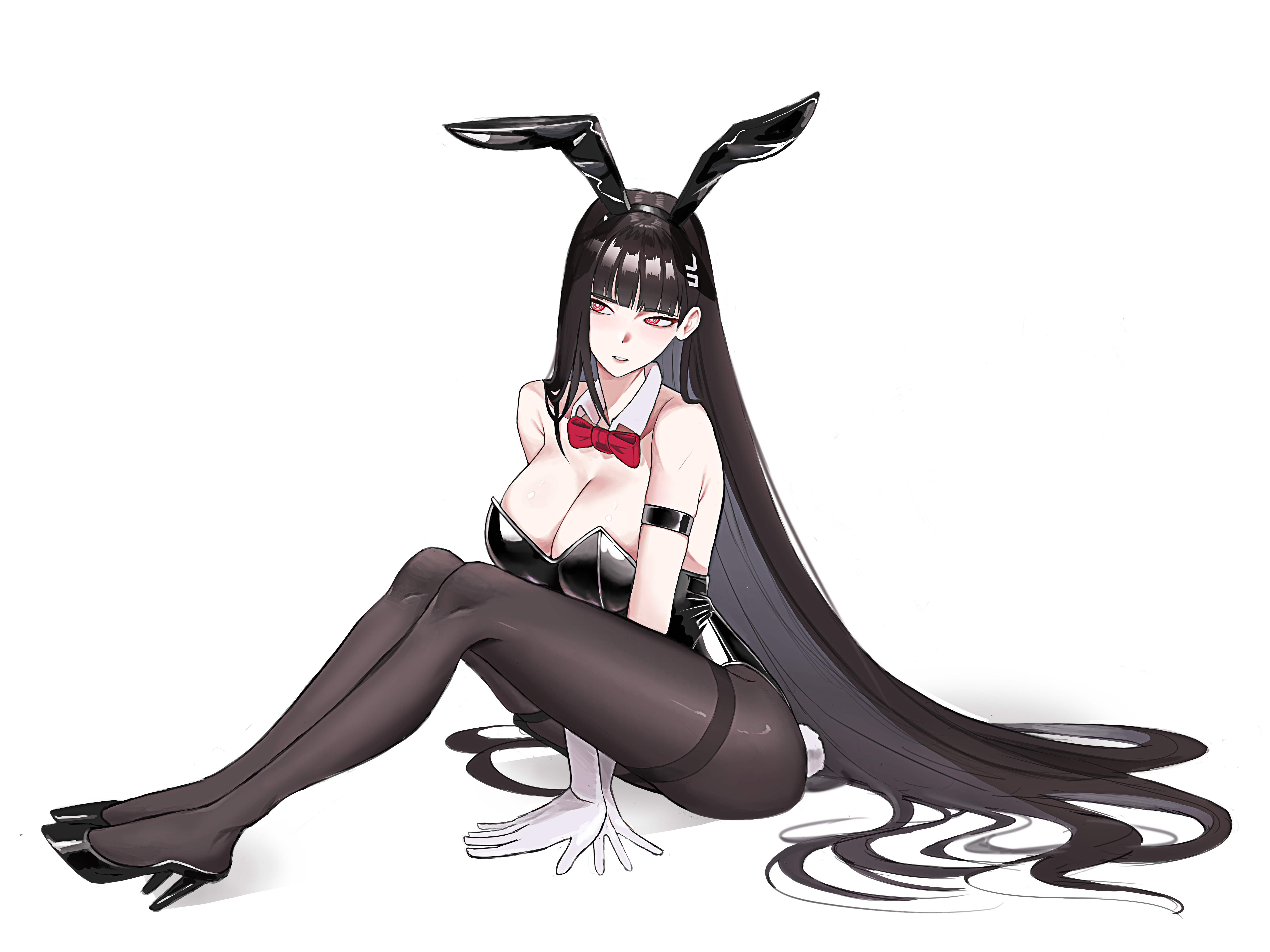 1girlanimal earsbare shouldersblack hairblack pantyhoseblack shoesblunt bangsbowbowtiebreastscatprecleavagedetached collarfake animal earsgloveshair ornamenthaircliphalohigh heelslarge breastslong hairpantyhoseparted lipsplayboy bunnyrabbit earsrabbit tailred bowred bowtiered eyesringed eyesshoessimple backgroundsittingsolotailthighband pantyhosevery long hairwhite backgroundwhite gloves