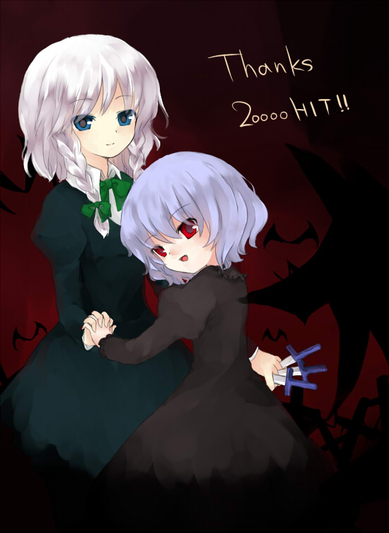 2girlsbetween fingersblue eyesblue hairbraidfemale focusformal clothesholdingholding handsknifemultiple girlsred eyesribbonshort hairthrowing knifetwin braidsweapon