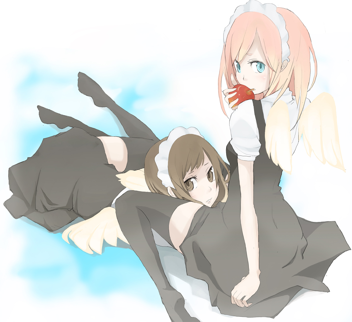 2girlsapplebetween legsblue eyesblushbrown eyesbrown hairfoodfruitholdingholding foodholding fruitkneelinglap pillowlyingmaidmultiple girlspink hairplantar flexionshort hairsittingsocksthighhighswingsyuri