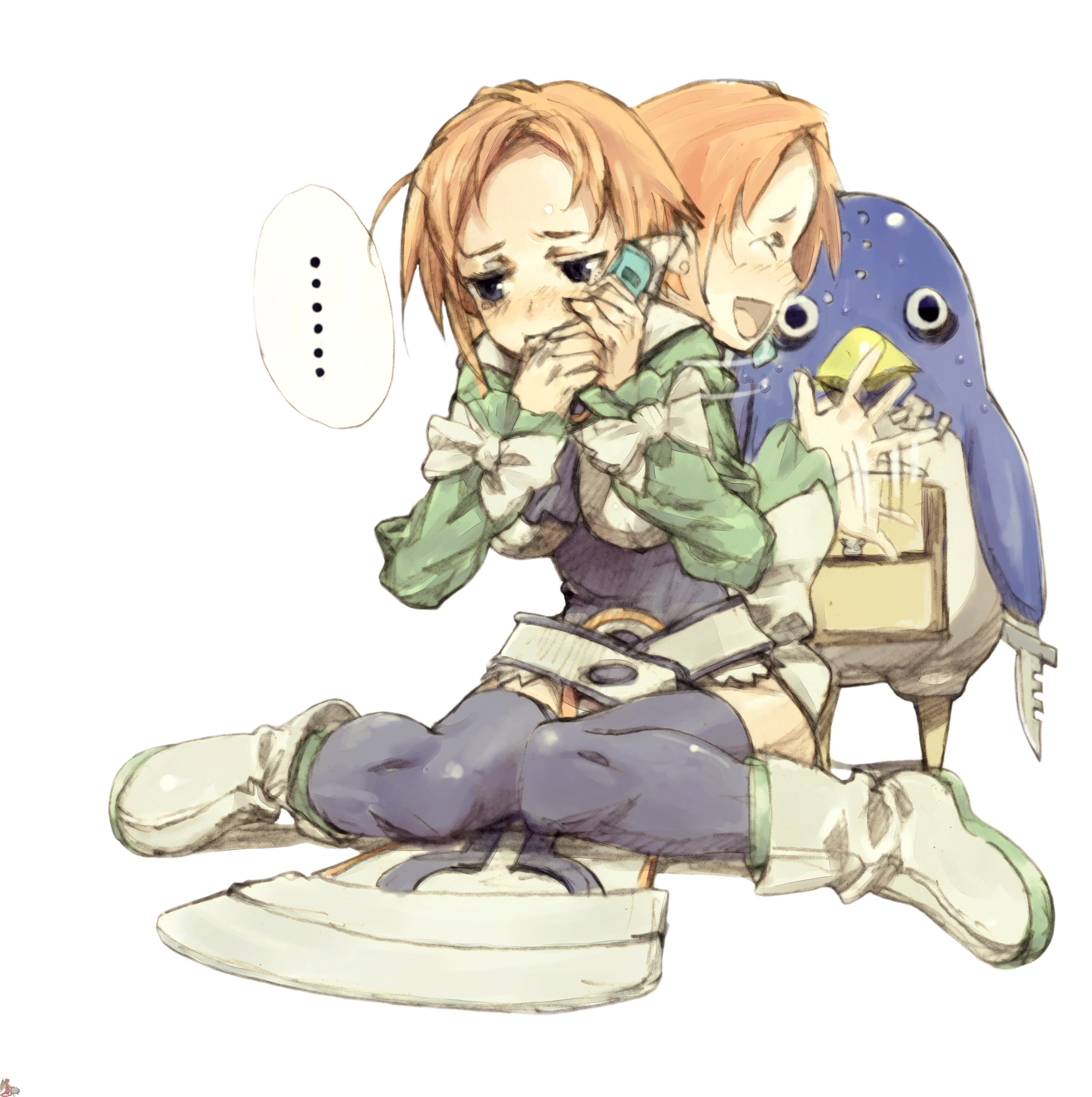 :d1boy1girlafterimageangryascotbagbeltbirdblack eyesblue eyesblue thighhighsblushbootsbowbreastscellphoneclosed eyesearringsfemale focusfull bodygemgreen shirtholdingjewelryknifelarge breastsleotardloinclothmotion bluropen mouthorange hairparted bangspenguinphonesatchelshirtshort hairsimple backgroundsittingsmilesolospeech bubblestandingsweatthighhighswavingweaponwristbandzettai ryouiki