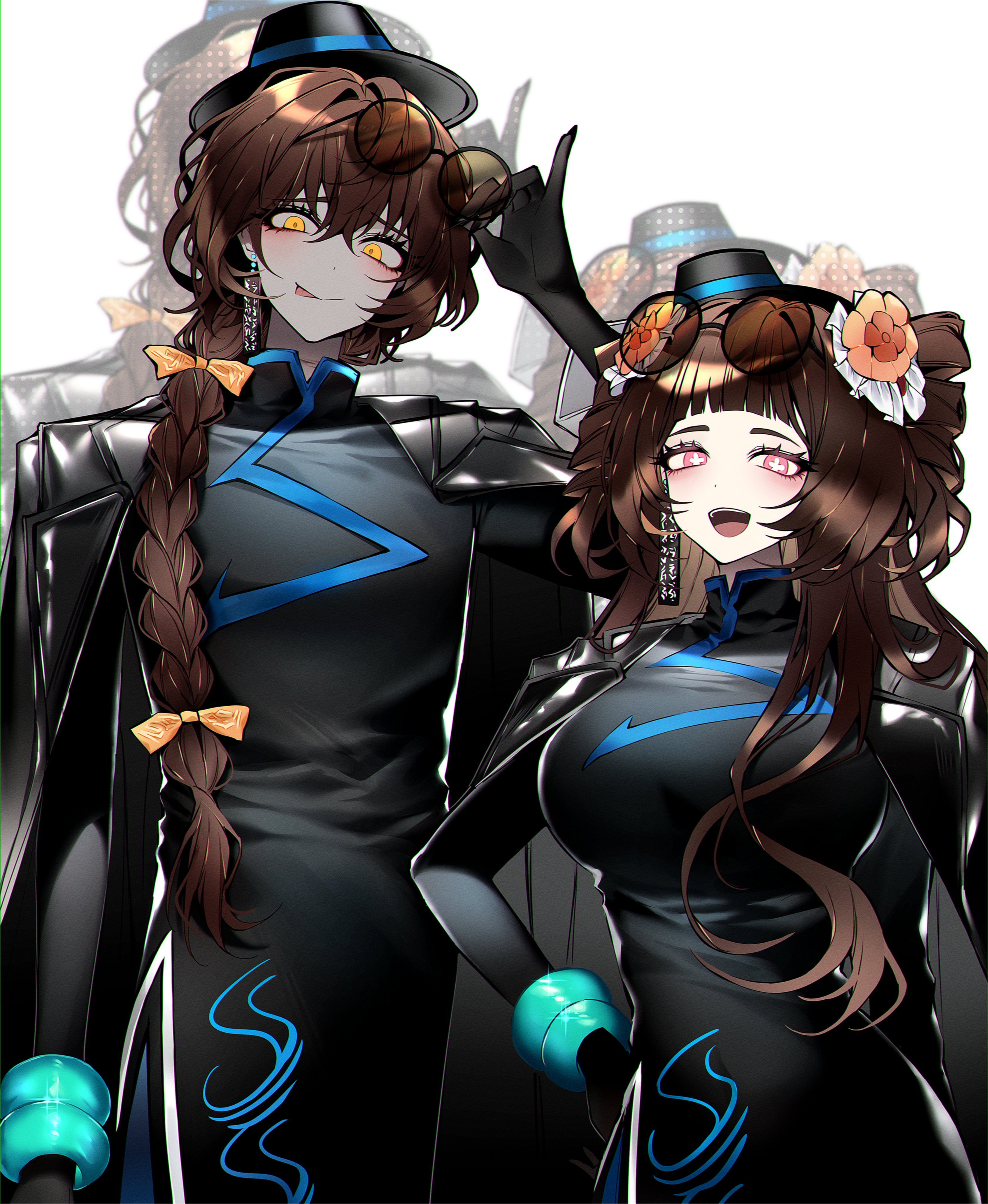 :d:p1boy1girlalternate hairstyleblack coatblack dressblack glovesblack hatbowbreastsbrown hairbrown-tinted eyewearchina dresschinese clothescinq association east uniformcoatcoat on shoulderscolored skindressdrill hairearringsflowerglassesglovesgrey skinhair bowhair flowerhair ornamenthatjade braceletjewelrylong hairlong sleeveslooking at viewerofuda earringsopaque glassesopen mouthorange bowpartially opaque glassespartially opaque sunglassespink eyesround eyewearsiblingssimple backgroundsingle earringsmilestandingsunglassestilted headweartinted eyeweartonguetongue outtwin drillsupper bodywhite backgroundxue pan (project moon)yellow eyes