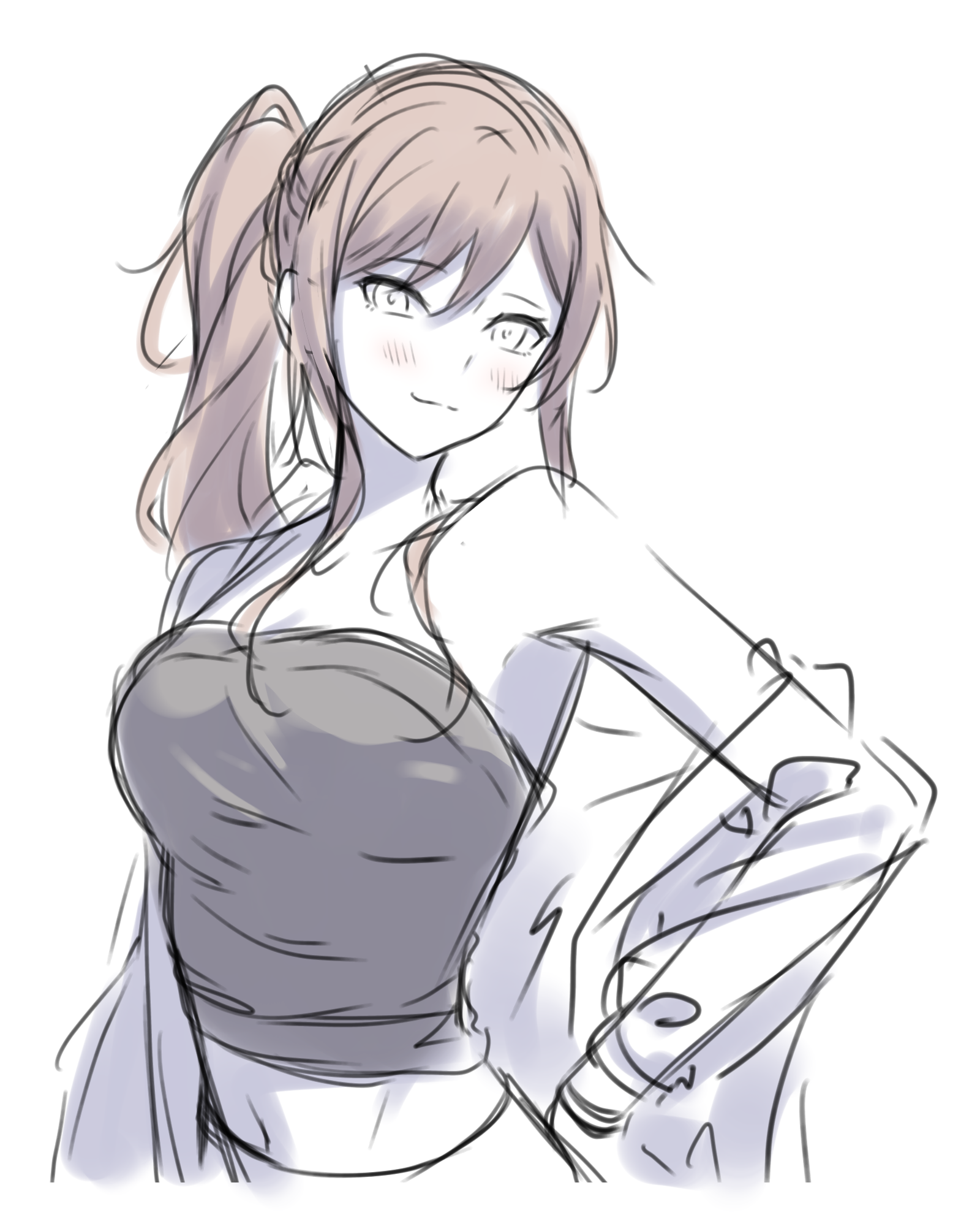 1girlalternate hairstyleblack shirtbreastsbrown hairjacketlarge breastslong hairmidriffnaveloff shoulderopen clothesopen jacketshirtside ponytailsidelockssimple backgroundsolostraplessstrapless shirtwhite background