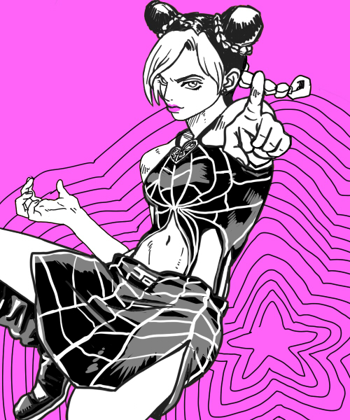 1girlbare shouldersbootsbraiddouble bunfemale focushair bunlipslipstickmakeupmidriffnavelpink lipspointingskirtsolostar (symbol)
