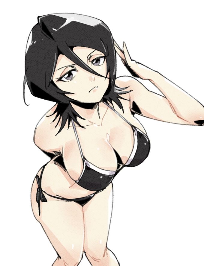 1girlalternate breast size (larger)arm behind backbare shouldersbikiniblack hairbreastsclosed mouthcollarbonefemale focuslarge breastsmedium hairsimple backgroundswimsuitwhite background
