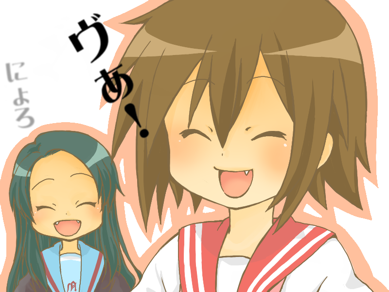 00s1boybrown hairclosed eyescrossoverfangfangsgreen hairhappylong hairschool uniformserafukushort hairsmileva (phrase)