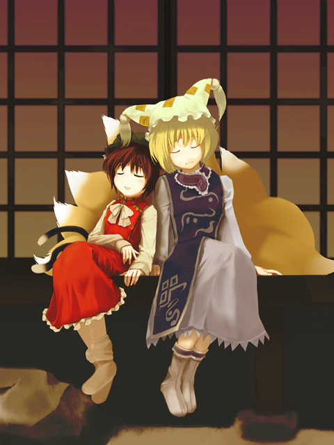 2girlsanimal earsanimal hatblonde hairbrown haircat earscat girlcat tailclosed eyesfemale focusfox earsfox tailhatlong sleevesmob capmultiple girlsmultiple tailsribbonshort hairsleepingsockstailtassel