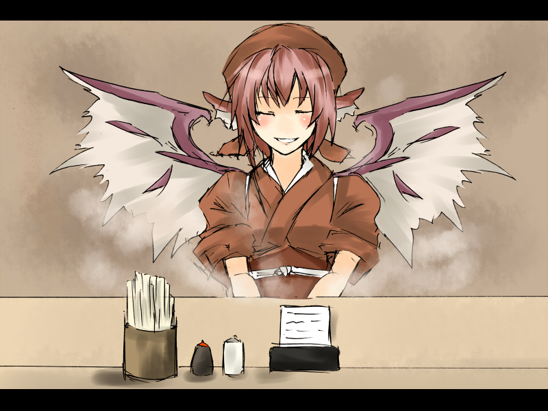 1girlanimal earsblushclosed eyesfemale focusfood standgrillhatjapanese clothesletterboxedpink hairshort hairsmilesolosteamtasukiwings