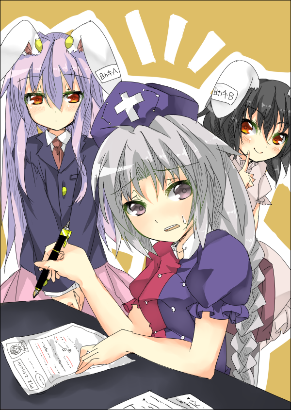 3girlsanimal earsblack hairblazerbraidconfusedfemale focusfinger to mouthgrey hairhatjacketlong hairlooking at viewermultiple girlsnurse capone eye closedpaperpenpurple hairrabbit earsshort hairshort sleevessingle braidsittingskirtsweattablevery long hairwinkwriting