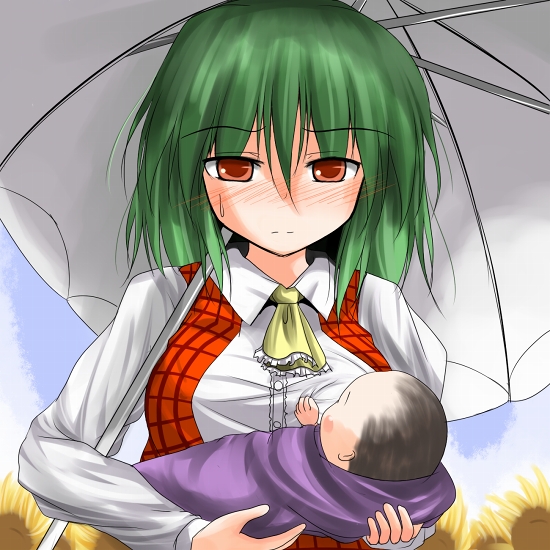 1girlage differenceascotbabyblue skyblushbreastschilddayembarrassedfemale focusflowergrabbing another's breastgreen hairgropinglarge breastsnose blushparasolplaid clothesplaid vestred eyesshort hairskysolo focussunflowersweatdropumbrellaupper bodyvest