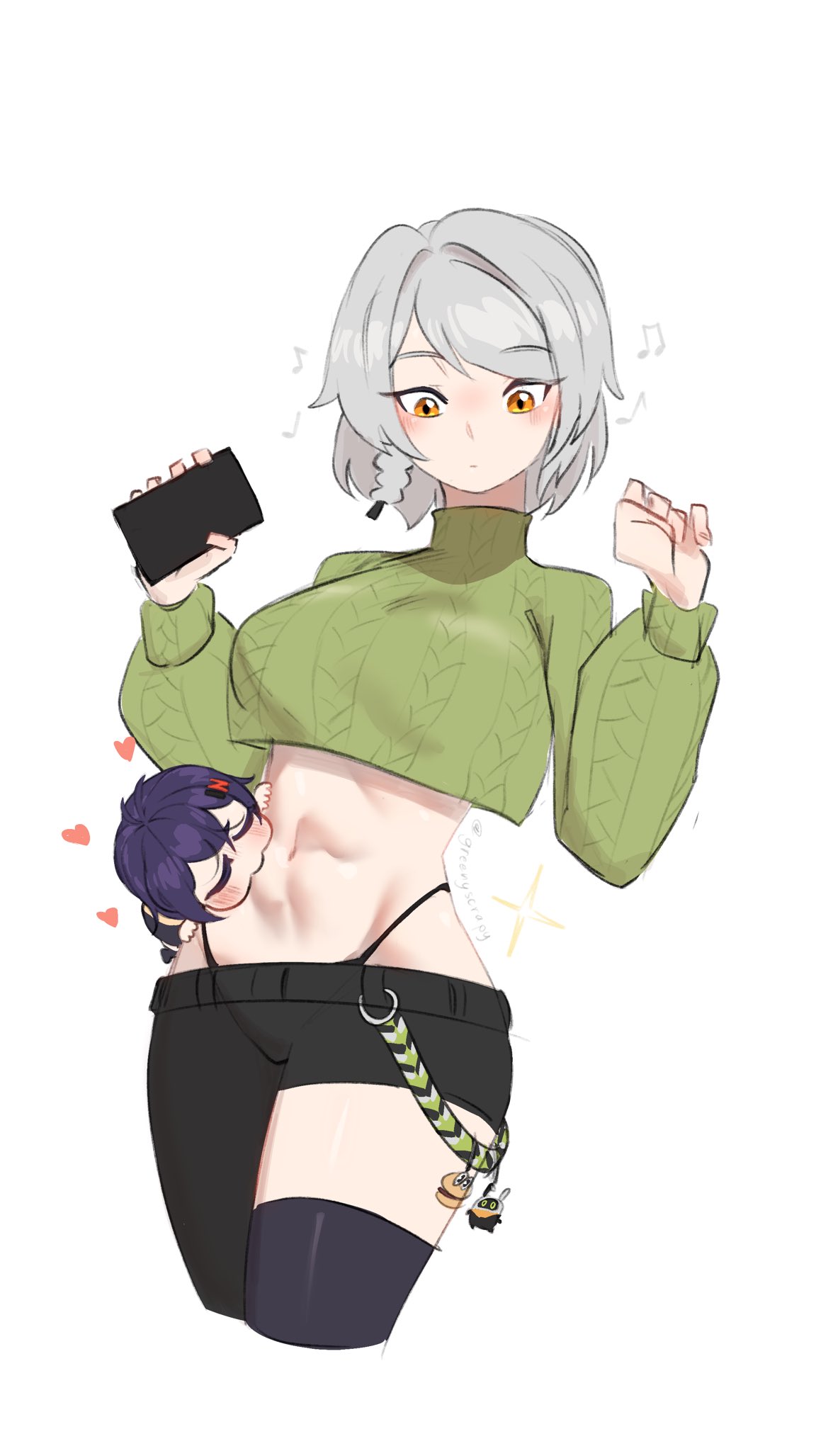 2girlsabsarms upblack pantsblue hairblushbraidbraided sidelocksburgercharm (object)closed eyesclosed mouthfoodgreen sweatergrey hairhair ornamentheartholdingholding phoneletter hair ornamentlooking at anothermidriffmultiple girlsmusical notenavelorange eyespantiespantsphonesingle thighhighsparklestomachstring pantiessweaterthighhighsunderwearwhite background