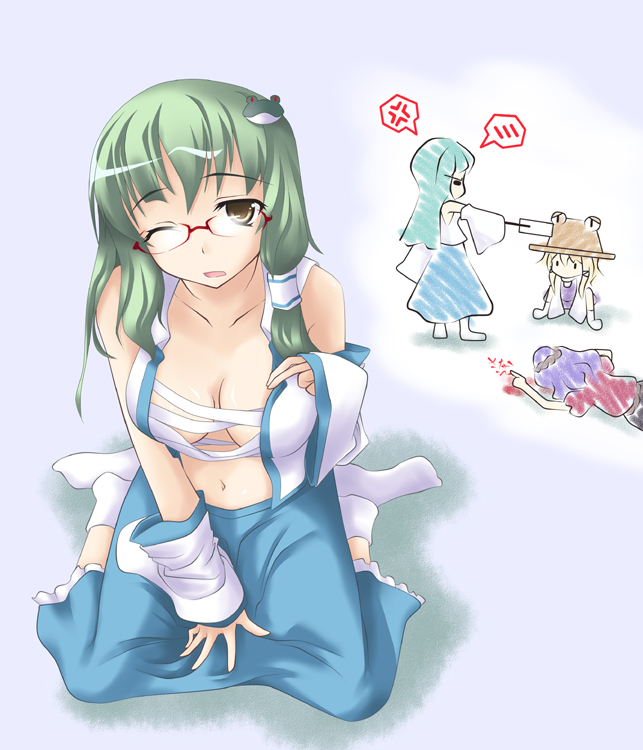 3girlsbespectacledbloodfemale focusglassesgreen hairmultiple girlsred-framed eyewearsarashiundone sarashi