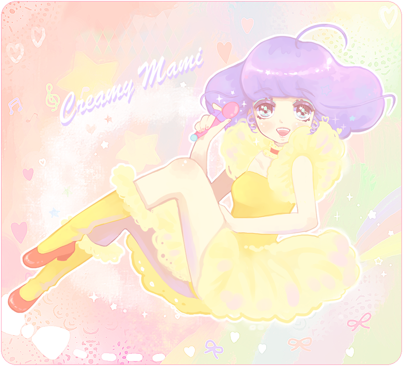 1girlahogedressfemale focusfrillsheartidolleotardmagical girlmicrophoneoldschoolpurple hairretro artstylesmilesockssolostar (symbol)