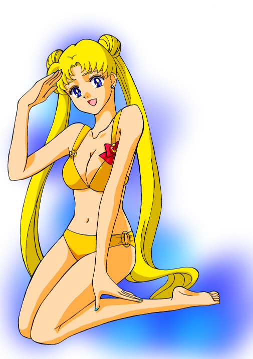 1990s (style)1girlbarefootbikiniblonde hairblue eyesblue nailsbreastscleavagefeetfemale focusfull bodylong hairnail polishretro artstylesalutesolessoloswimsuitvery long hairyellow bikini