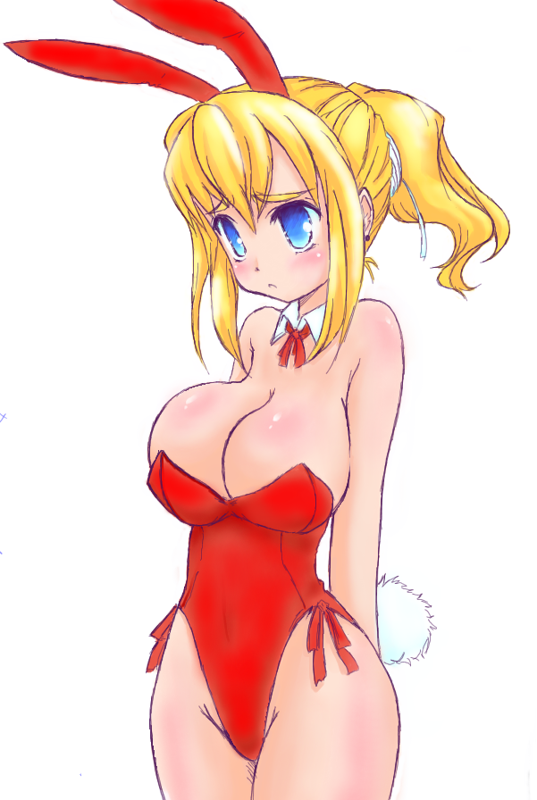 1girlanimal earsbare legsblonde hairblue eyesbowbowtiebreastsdetached collarfake animal earsfemale focuslarge breastslong hairplayboy bunnyponytailrabbit earsred bowred bowtiesolo