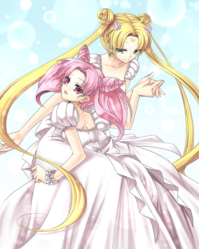 1990s (style)2girlsage differenceblonde hairblue eyeschildcone hair buncrescentcrescent facial markdouble bundressearringsfacial markgownhair bunhair ornamenthairclipholding handsinterlocked fingersjewelrylong hairmother and daughtermultiple girlspink eyespink hairretro artstyleshort twintailstwintailswhite dress