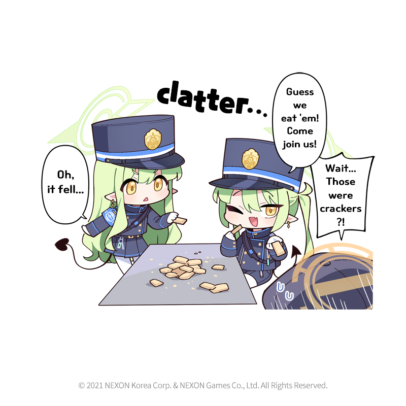 3girlschibidemon tailearringsenglish textfangfoodglovesgreen hairhair between eyeshatholdingholding foodjacketjewelrylong hairlong sleevesmultiple girlsno noseone eye closedopen mouthpantyhosepleated skirtpointy earsskin fangskirtspeech bubblestandingtailtriangle mouthtwintailsv-shaped eyebrowsvery long hairwhite gloves