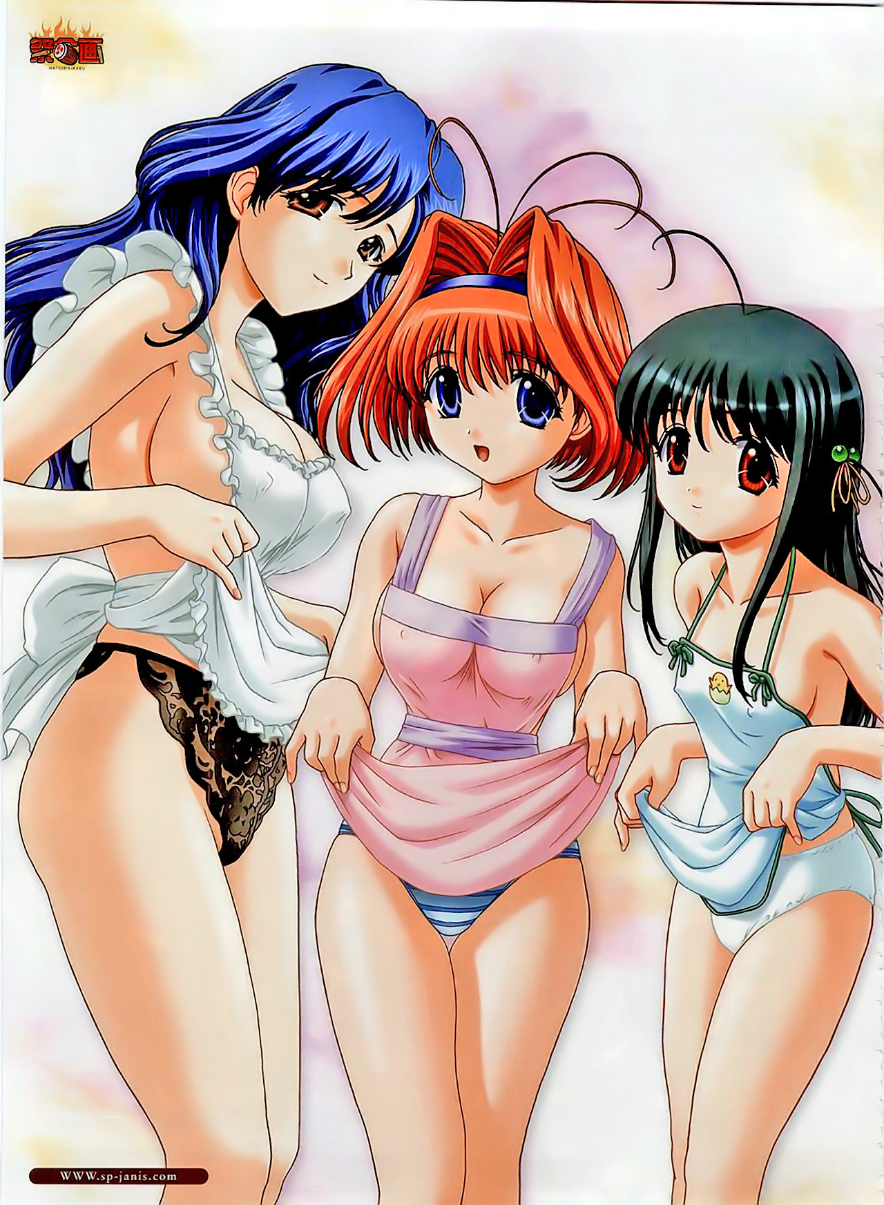 3girlsahogeapronapron liftblue eyesblue hairbreastsbrown eyesclothes liftgreen hairhair intakeshairbandheadbandlacelarge breastslong hairmedium breastsmultiple girlsnaked apronorange hairpantiesred eyesstriped clothesstriped pantiesunderwearwhite panties