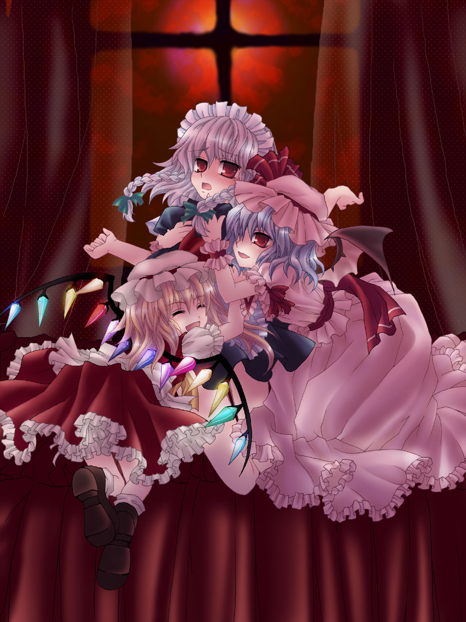 3girlsblonde hairblue hairblushfemale focushathugmaidmob capmultiple girlsponytailribbonshort hairwings