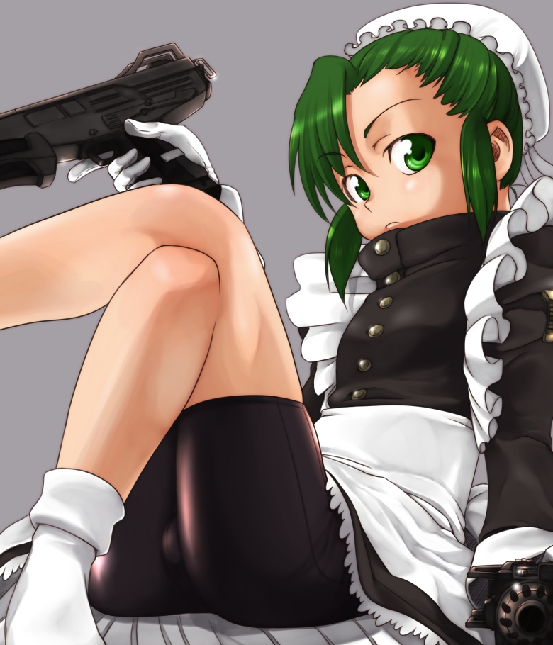 00s1girlapronbike shortsbun covercrossed legsdual wieldingfemale focusfrillsglovesgreen eyesgreen hairgunholdingloose socksmag-7maidmaid apronmatching hair/eyespump actionpump-action shotgunshort twintailsshotgunsidelockssittingsockssolotwintailsweaponwhite gloves