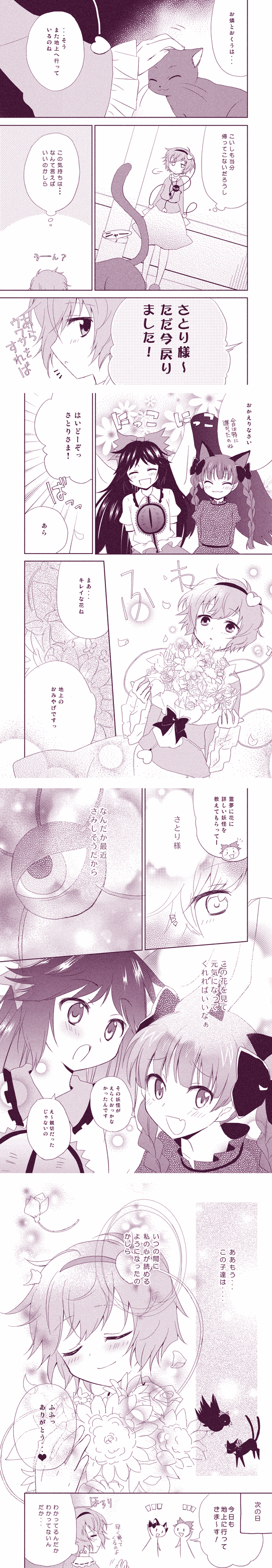 arata iri, commentary request, 3girls, :t, anger vein, bow, bowtie, clenched teeth, closed mouth, collared shirt, fang, flying sweatdrops, frown, greyscale, hair between eyes, japanese clothes, long hair, low ponytail, low twintails, miko, monochrome, multiple girls, nekozaki ren, open mouth, ponytail, profile, school uniform, sharp teeth, shirt, shishimaru airi, short sleeves, side ponytail, sidelocks, speech bubble, split mouth, steam, sweatdrop, teeth, todo no tsumari no uchoten, twintails, twitter username, v-shaped eyebrows, yamada mikoto (arata iri)
