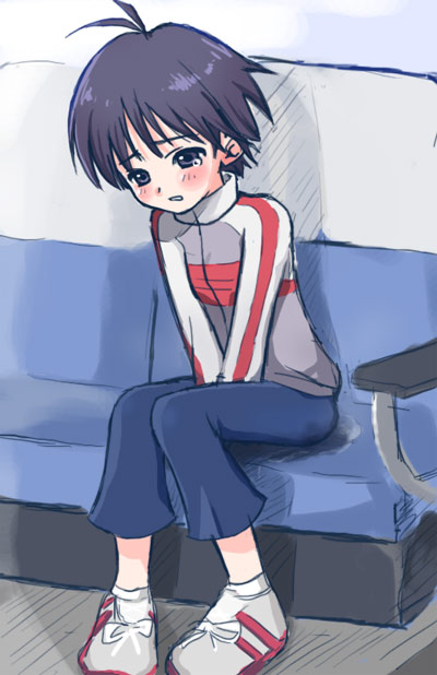 00santenna hairblack eyesblack hairblue upholsterycouchdenimjacketjeanspantspeeingpeeing selfraglan sleevessadshort hairsittingsolotears