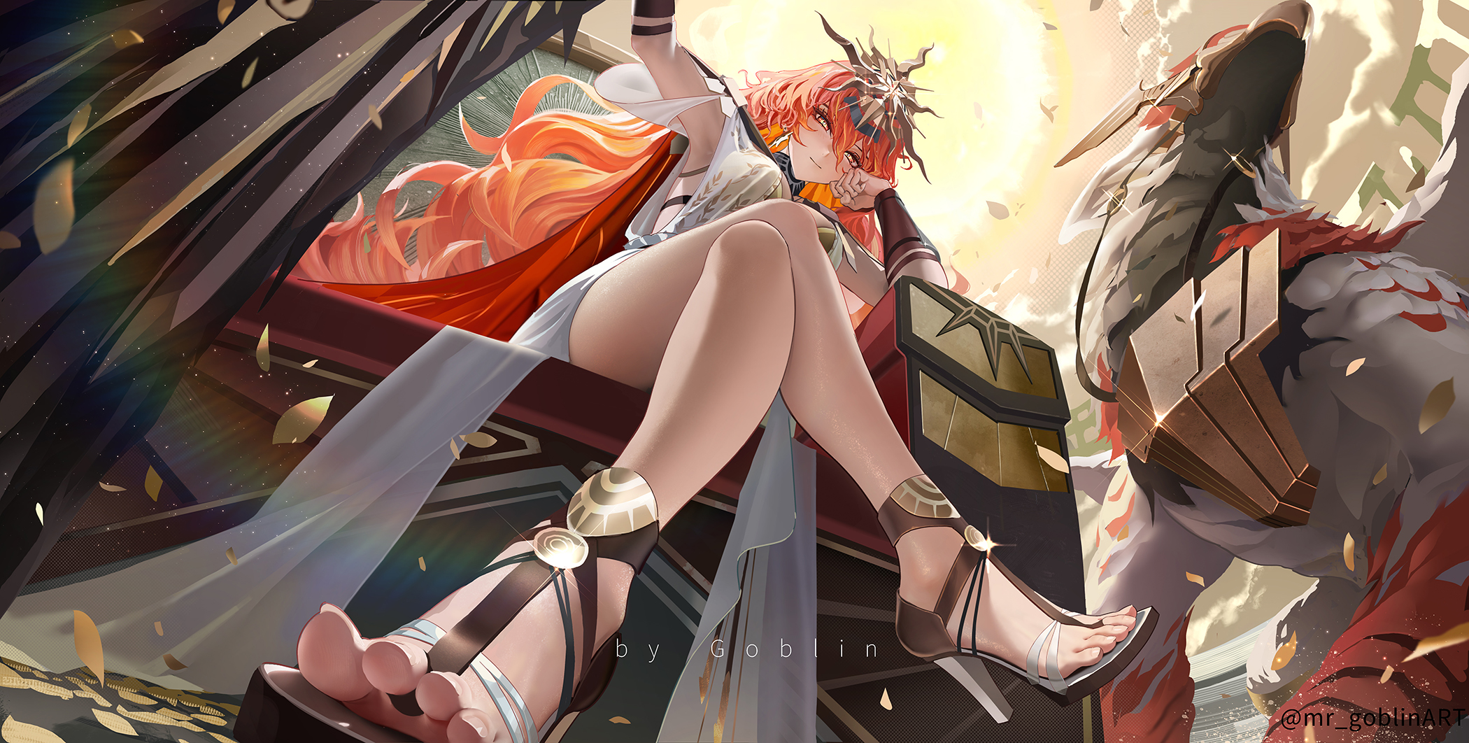 1girlarm armorarmorartist namebare legsbreastplatebreastsclosed mouthcrossed legsfeetfrom belowhair between eyesheadgearhigh heel sandalslegslong hairlooking at viewerlooking downmedium breastsmissing commentaryorange hairorange skyred eyessandalsskysolosuntacet discord (wuthering waves)toenailstoesvery long hair