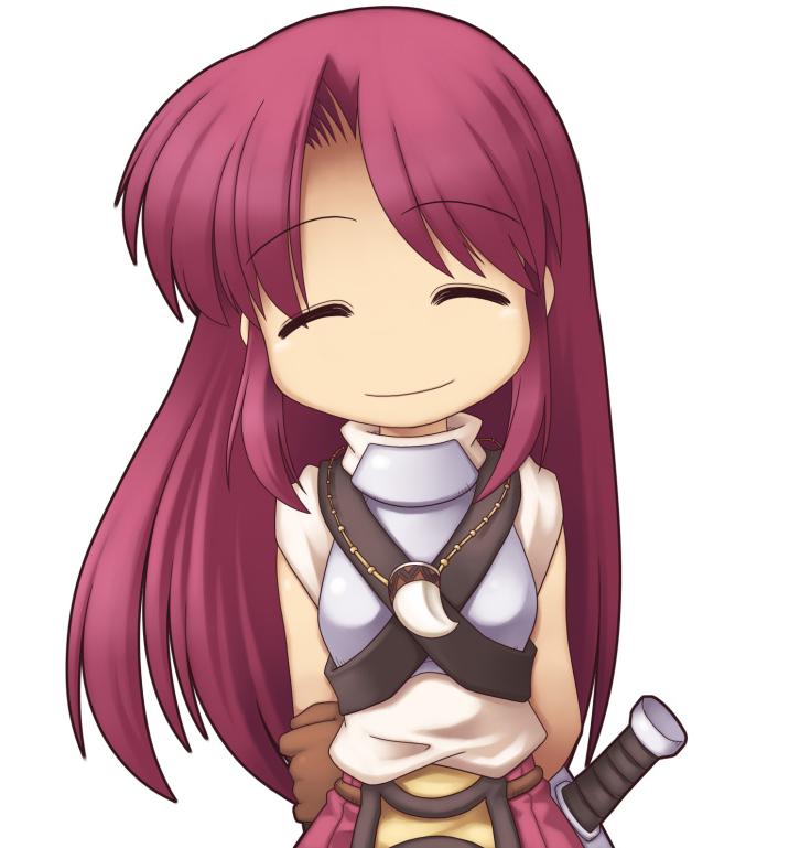 1girlarmorchibiclosed eyesfemale focusglovesjewelrynecklacepurple hairraglan sleevessimple backgroundsmilesoloswordweaponwhite background