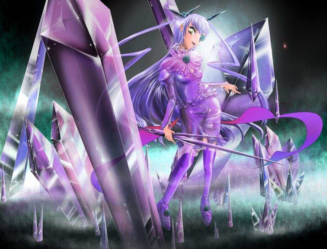 00sbootscrystaldresseyepatchflowerfrillslong hairpurple hairrosesolotwintailstwo side upweaponyellow eyes