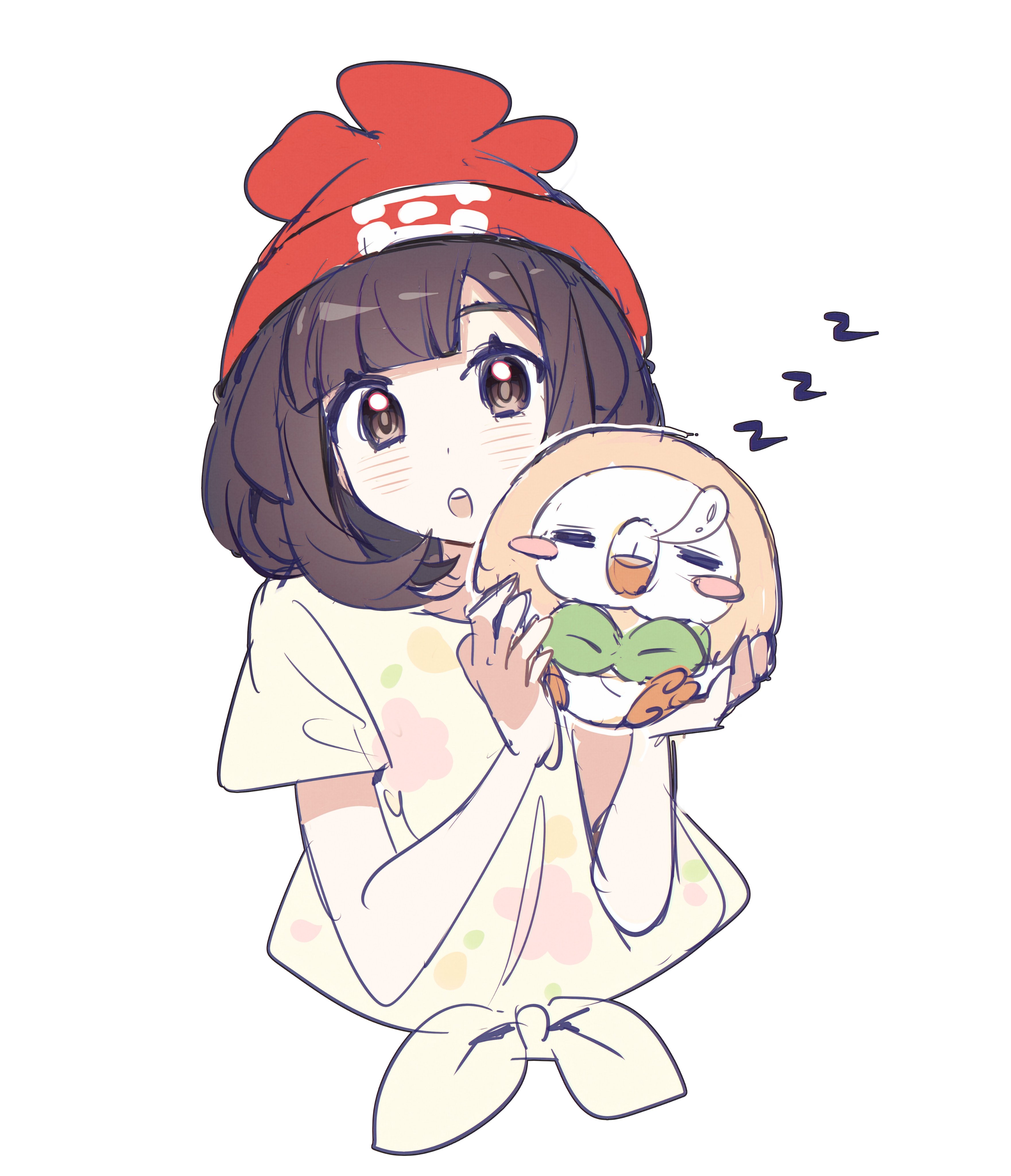 1girlbeaniebirdblack hairblushbrown eyesbubbleclosed eyesfloral printgen 7 pokemonhatholdingholding pokemonlooking at viewernose bubbleopen mouthowlpokemon (creature)red hatshirtshort hairshort sleevessimple backgroundsleepingtied shirtupper bodywhite backgroundyellow shirtzzz