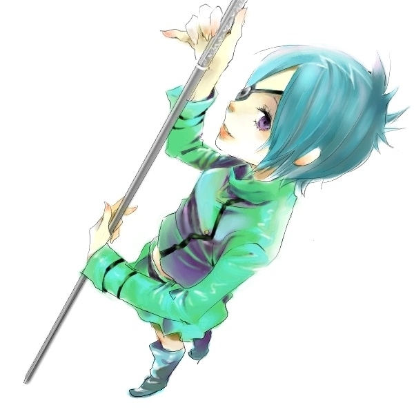 00s1girlblue hairbootseyepatchfemale focusfull bodyshort hairsimple backgroundsolostaffwhite background
