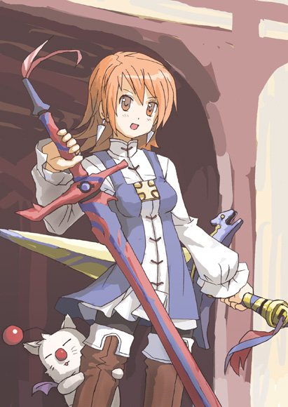 1990s (style)bootsdual wieldingearringsholdingjewelryorange eyesorange hairpantyhoseretro artstylesoloswordthigh bootsthighhighsweapon
