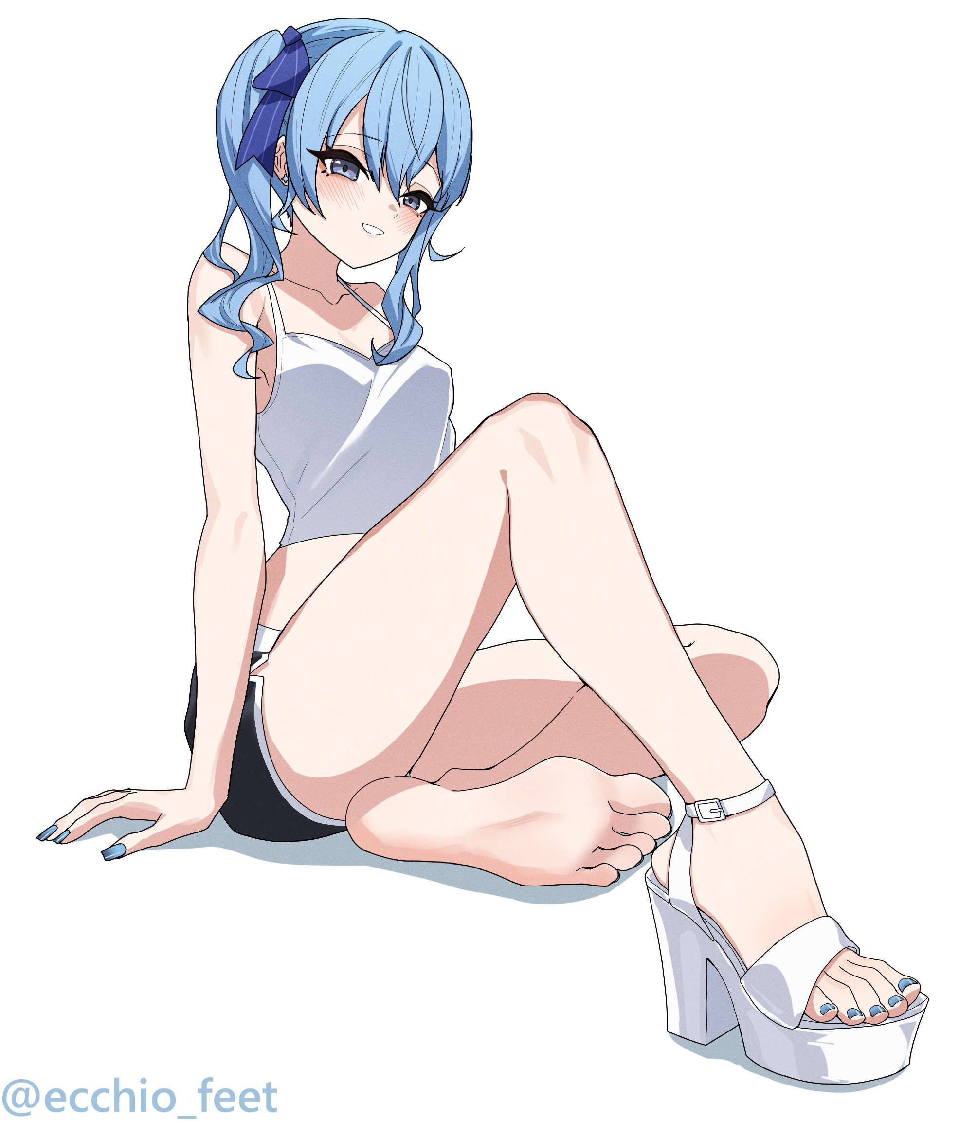 1girlbarefootblue eyesblue hairblushcamisoledolphin shortsfeetlong hairlooking at viewerparted lipsshoesshortsside ponytailsingle shoesolestoes