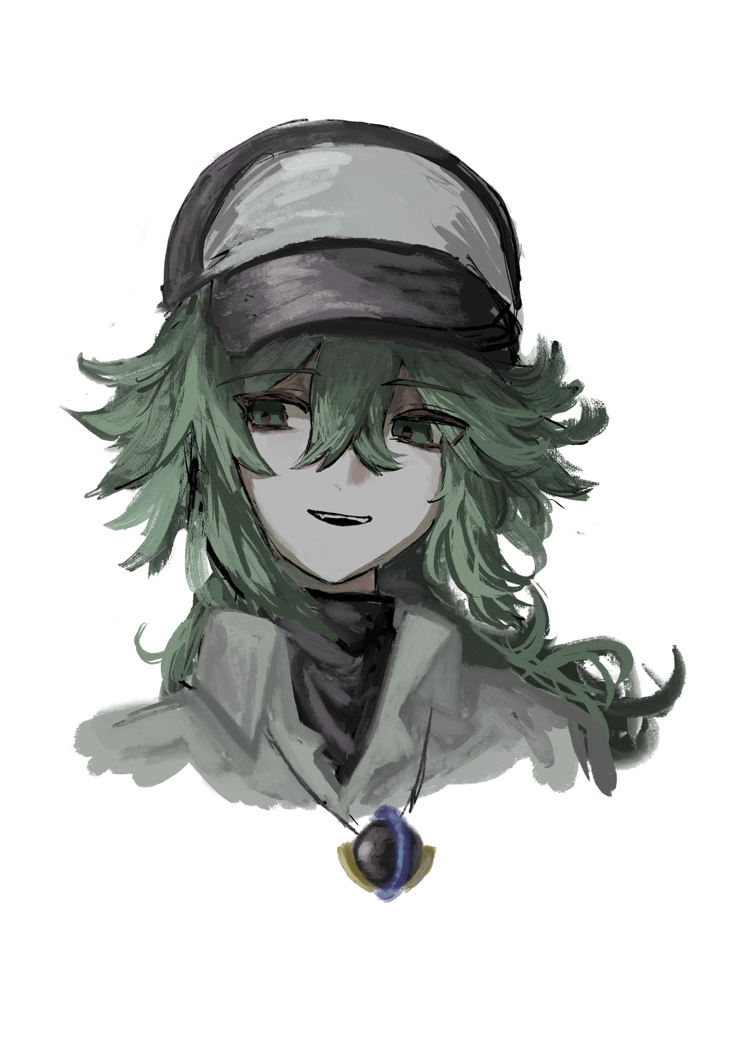 1boybaseball capblack shirtcollared shirtcropped shouldersgreen hairhair between eyeshatjewelrylong hairlooking to the sidemale focusnecklaceopen collarshirtsideways glancesimple backgroundsmileteethturtleneckupper teeth onlywhite backgroundwhite shirtwing collarxxeuplectellaxx