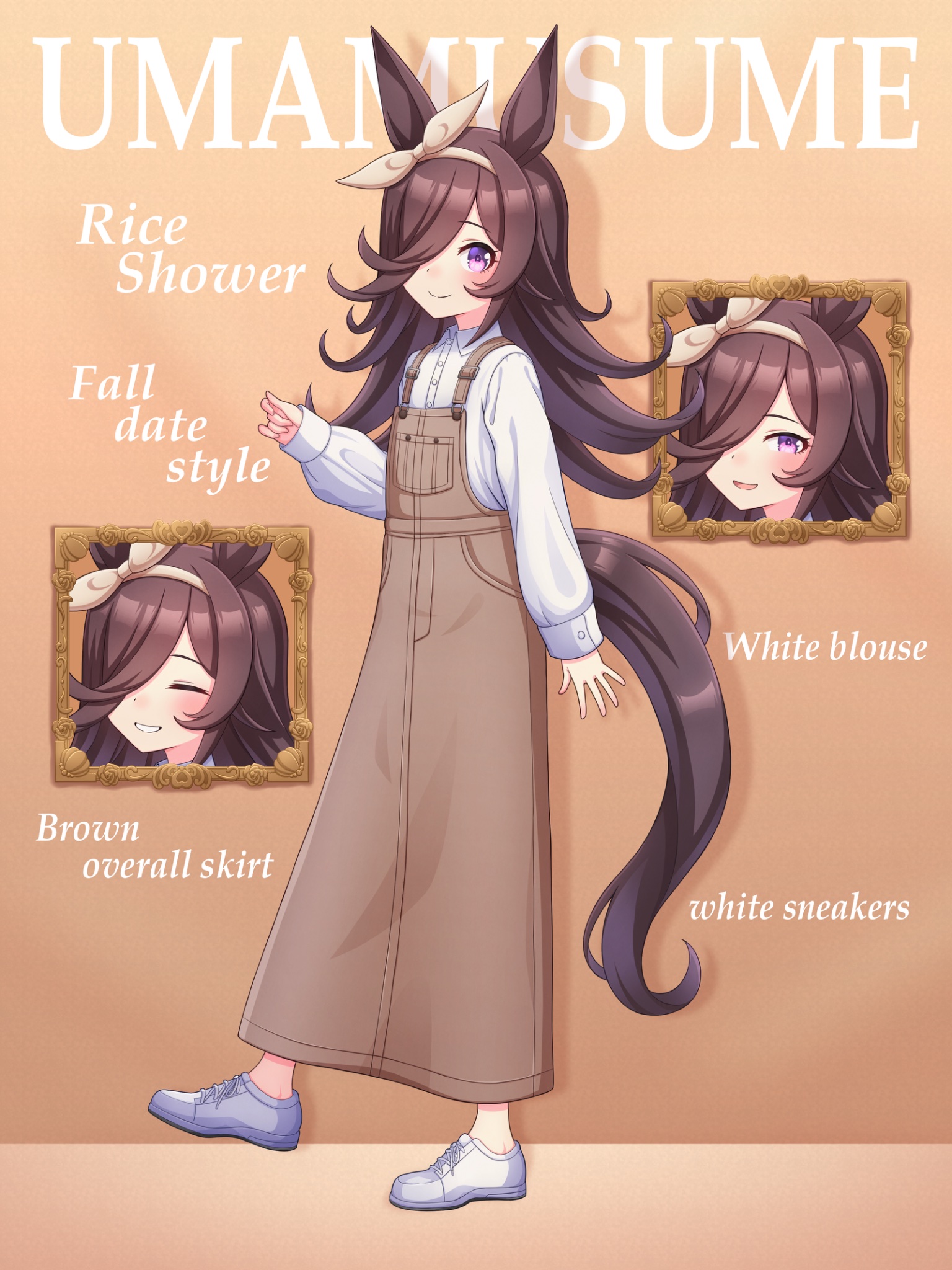 1girlalternate costumeanimal earsblouseblushbow hairbandbrown hairbrown overallsbrown skirtclosed eyesclosed mouthenglish textflipped hairhair over one eyehairbandhorse earshorse girllong hairlong sleeveslooking at vieweropen mouthoverall skirtoverallspurple eyesshirtshoesskirtsmilesolotailwhite shirt