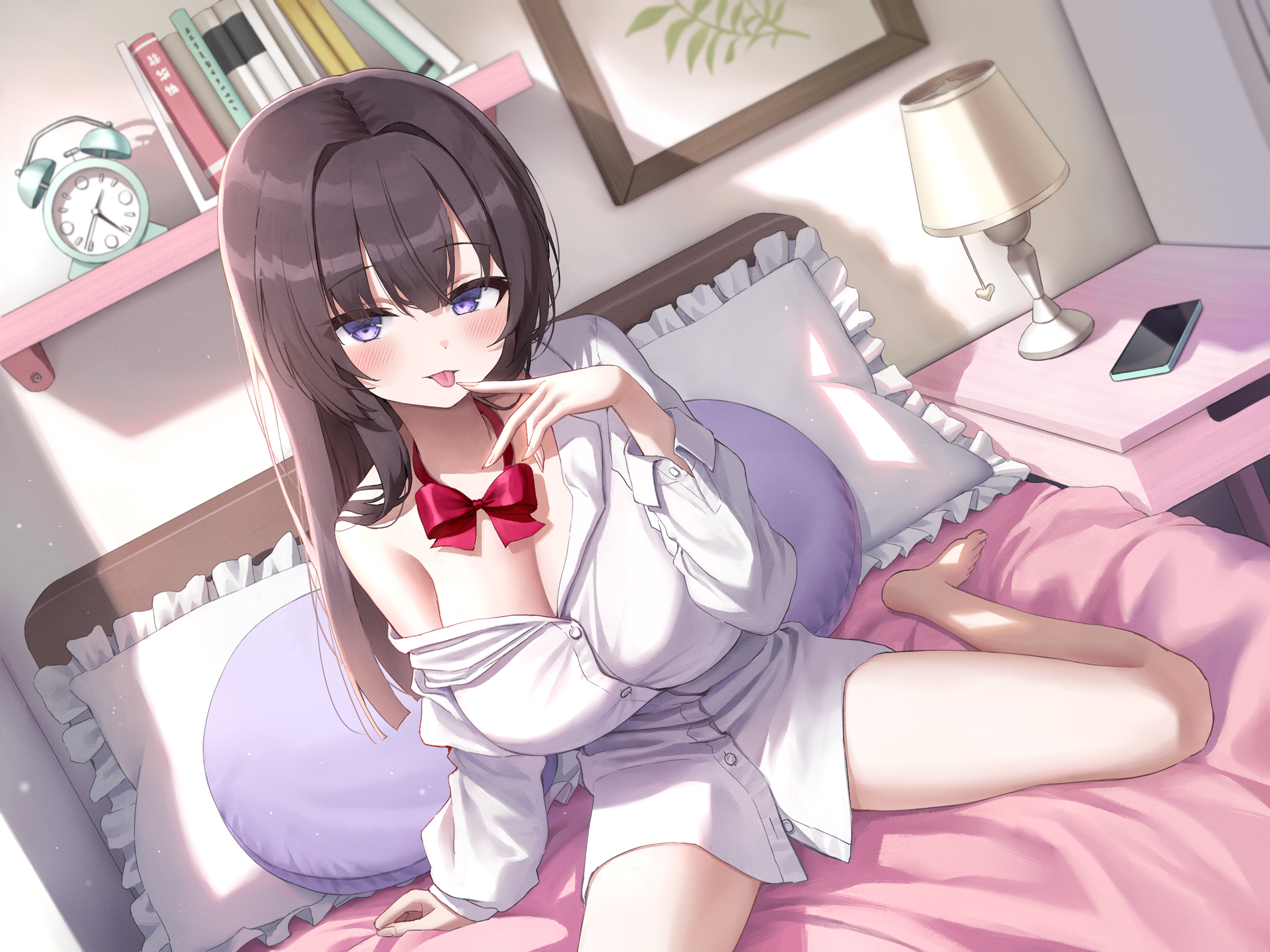 1girlbare legsbare shouldersbarefootbedblack hairblushbowbowtiebreastscleavagedress shirtdutch anglefinger to tonguehand upindoorslampshadelarge breastslong hairlong sleeveslooking at viewernaked shirtnaughty faceoff shoulderon bedparted lipspillowpurple eyesshirtsittingsolothighstonguetongue outwhite shirt