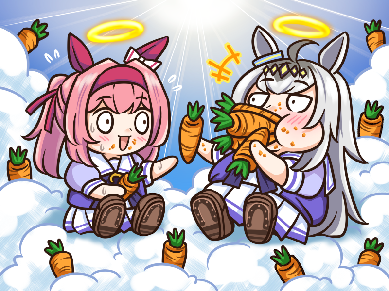 sigma117, amemiya darumi, maruko gaku, omokage yugamu, the hundred line -last defense academy-, 1girl, 2boys, backpack, bag, black boots, black bow, black hair, black pants, black shirt, black skirt, blood, blood on face, bloody tears, blue hair, boots, bow, chibi, ear piercing, earrings, eyepatch, face piercing, hand on own hip, jewelry, last defense academy school uniform, lip piercing, mulitcoloured hair, multiple boys, one eye closed, open mouth, pants, piercing, pink eyes, pleated skirt, red eyes, shirt, short hair, skirt, twintails, white background