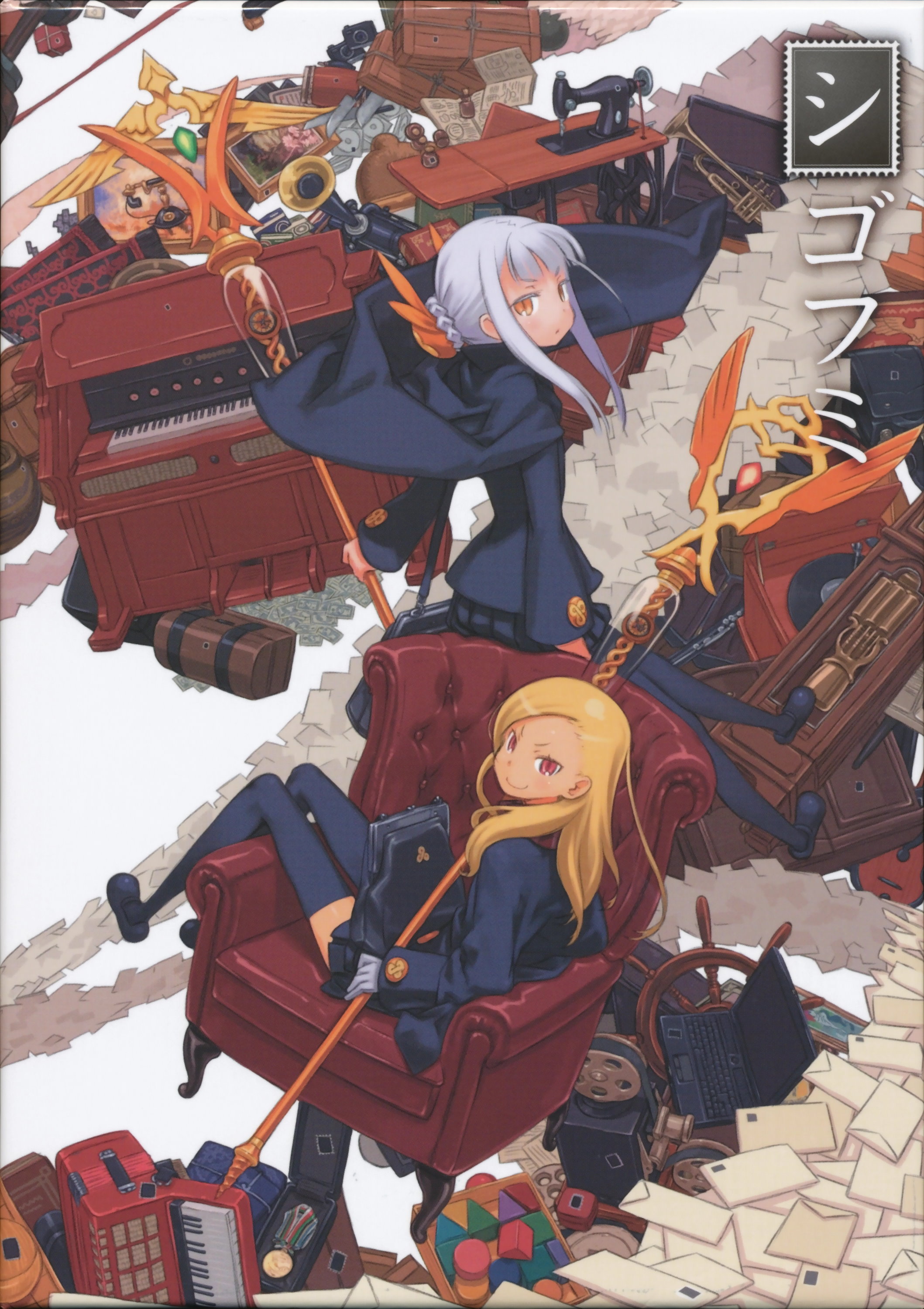 00s2girlsaccordionbagblonde hairbookcameracdcomputercorded phoneglovesinstrumentinstrument caseknifelaptoplettermedalmultiple girlsorange eyesorgan (instrument)painting (object)phonephonographpump organred eyessatchelsewing machinestaffthighhighstrumpetturntable