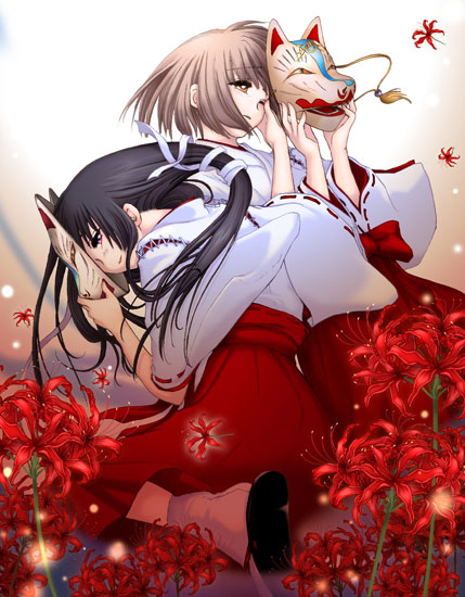 2girlsblack hairbrown hairflowerfox maskhakamahakama skirtjapanese clotheslong hairmaskmikomultiple girlspink eyesred flowerred hakamashort hairskirtspider lily