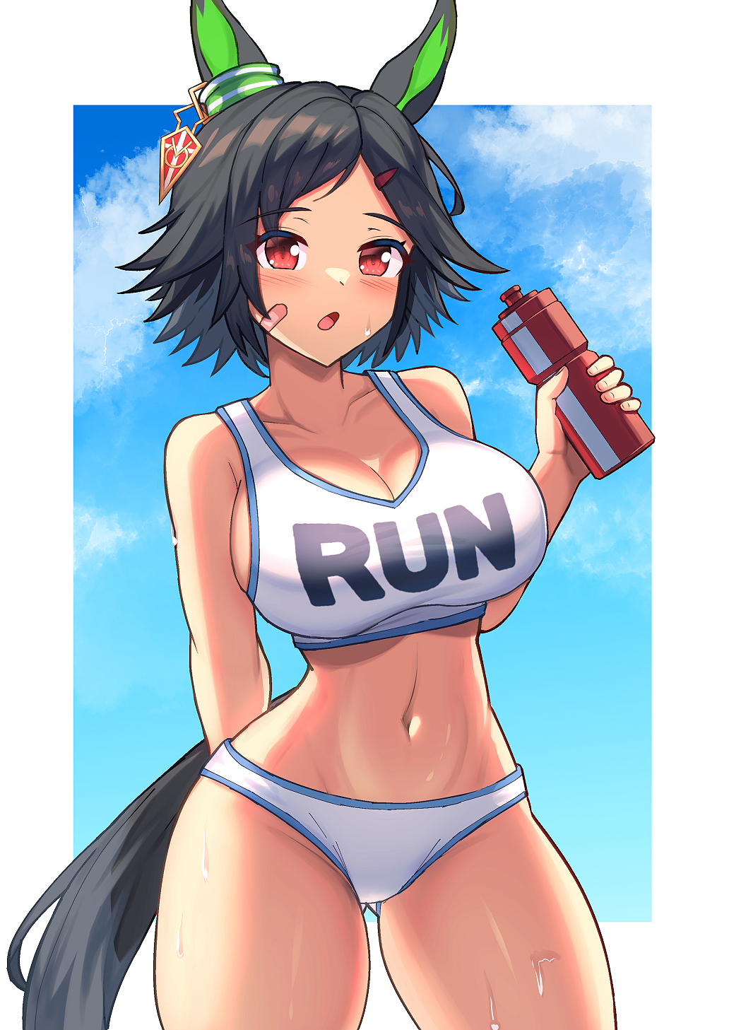 1girlanimal earsbandaidbandaid on cheekbandaid on facebikiniblack hairblue skyblushborderbottlebreastscleavagecowboy shotdaygluteal foldhair between eyesholdingholding bottlehorse earshorse girlhorse taillarge breastsopen mouthoutdoorsoutside borderred eyesshort hairskysolosweatswimsuittailwater bottlewhite bikiniwhite border