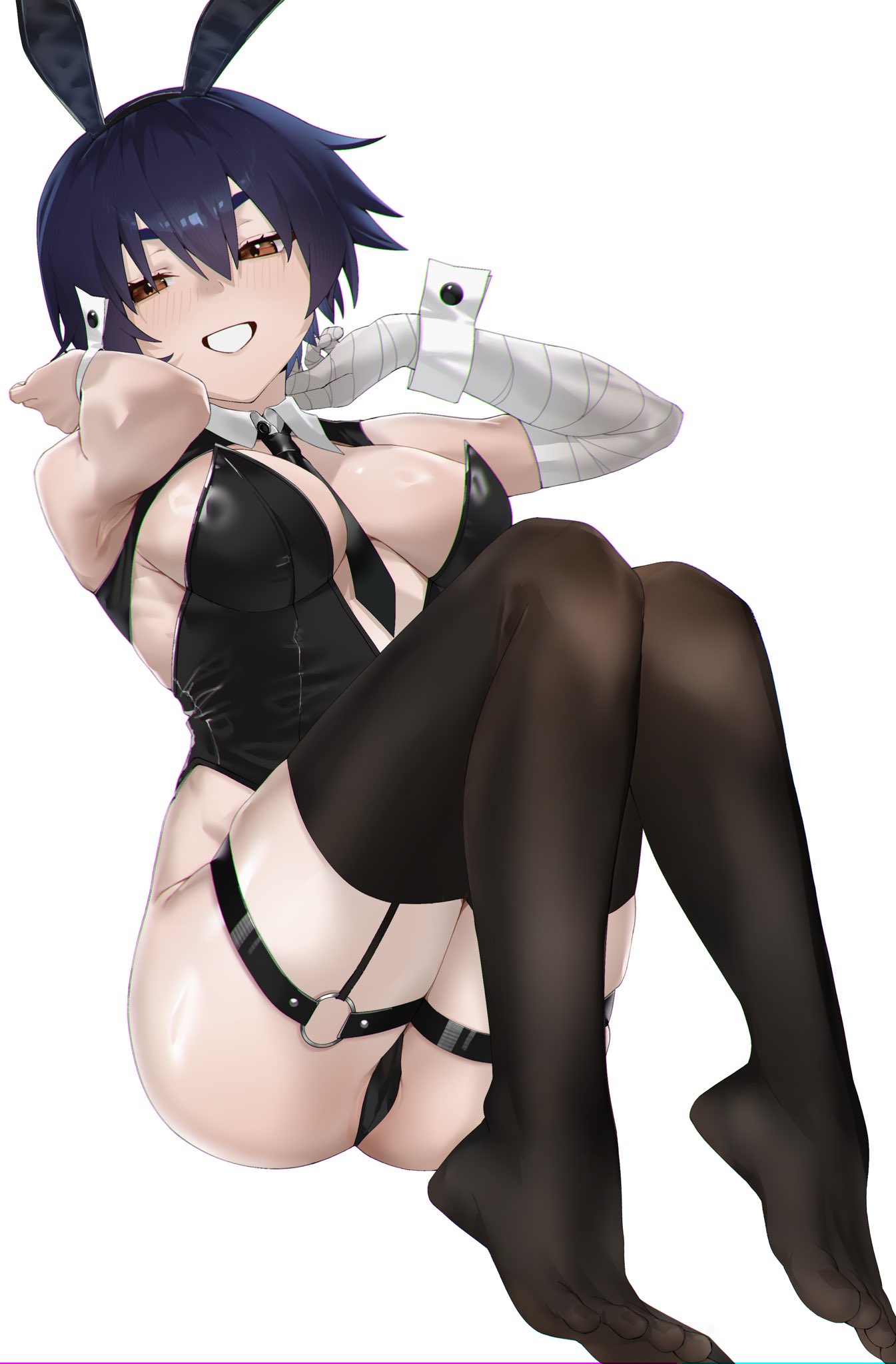1girlalternate costumeanimal ear hairbandanimal earsbandaged armbandagesbetween breastsblack hairblack leotardblack necktieblack thighhighsblushbreastsbrown eyesdetached collarfake animal earsfeetfull bodyhairbandhands uplarge breastsleotardlooking at viewernecktieopen mouthplayboy bunnyrabbit earsshort hairsimple backgroundsmilesolothighhighstoeswhite backgroundwhite mouthwhite wrist cuffswrist cuffs