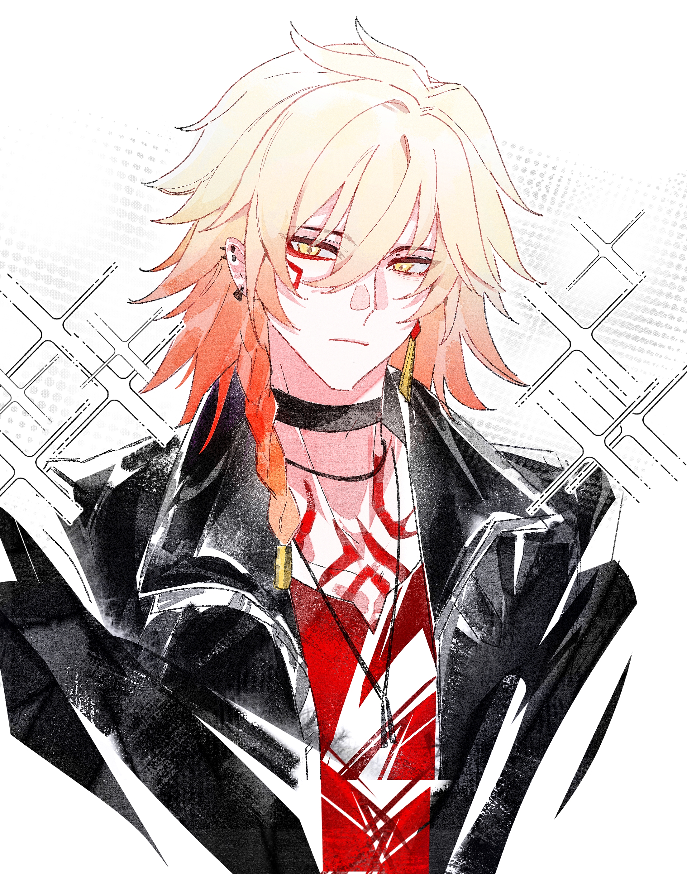 1boyblack chokerblack jacketblonde hairbraidchest tattoochokerearringsfacial tattoogamelife036gold earringsgradient hairjacketjewelrymale focusmedium hairmulticolored hairopen clothesopen jacketred hairred shirtred tattooshirtside braidsimple backgroundsolotattoowhite backgroundyellow eyes