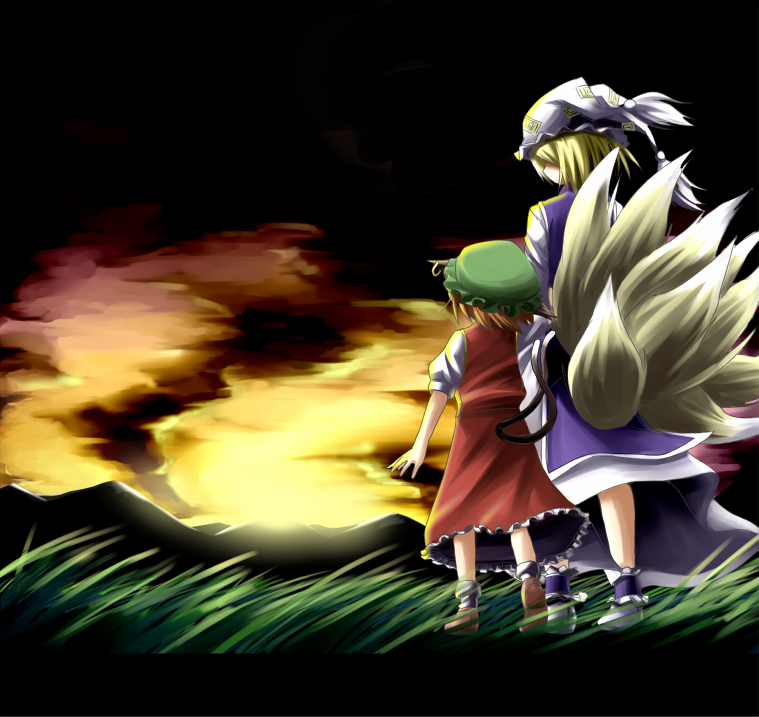 2girlsanimal earsanimal hatblonde hairbrown haircat earscat girlcat tailearringsfemale focusfox earsfox tailfrom behindhatjewelryletterboxedmob capmultiple girlsmultiple tailsoutdoorssceneryshoesshort sleevessocksstandingsunrisesunsettailtasseltwo tails
