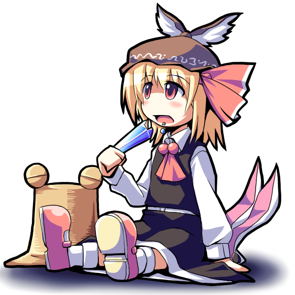 1girlanimal earsblonde hairblouseborrowed clothesbrown hatcollared shirtcrumbseatingfemale focusfoodfood on facehathead wingsheadwear switchicepink shoesrabbit earsred eyesribbonshirtshoesshort hairsittingsockssolowhite backgroundwhite shirtwhite sockswings