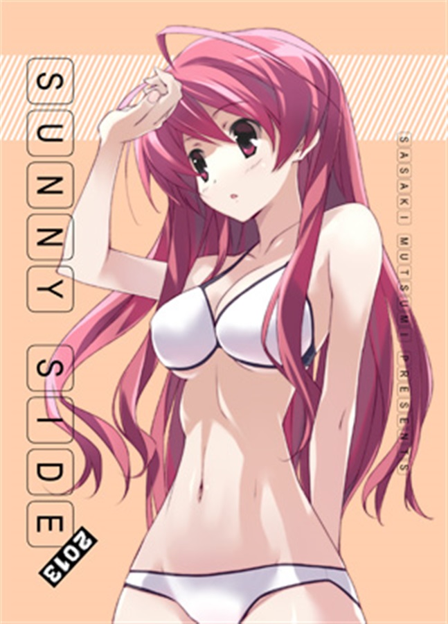 tokyo (great akuta), asakura ryoko, suzumiya haruhi no yuuutsu, 00s, 1girl, bikini, black border, border, breasts, circle cut, covered erect nipples, female focus, greyscale, medium breasts, monochrome, solo, swimsuit