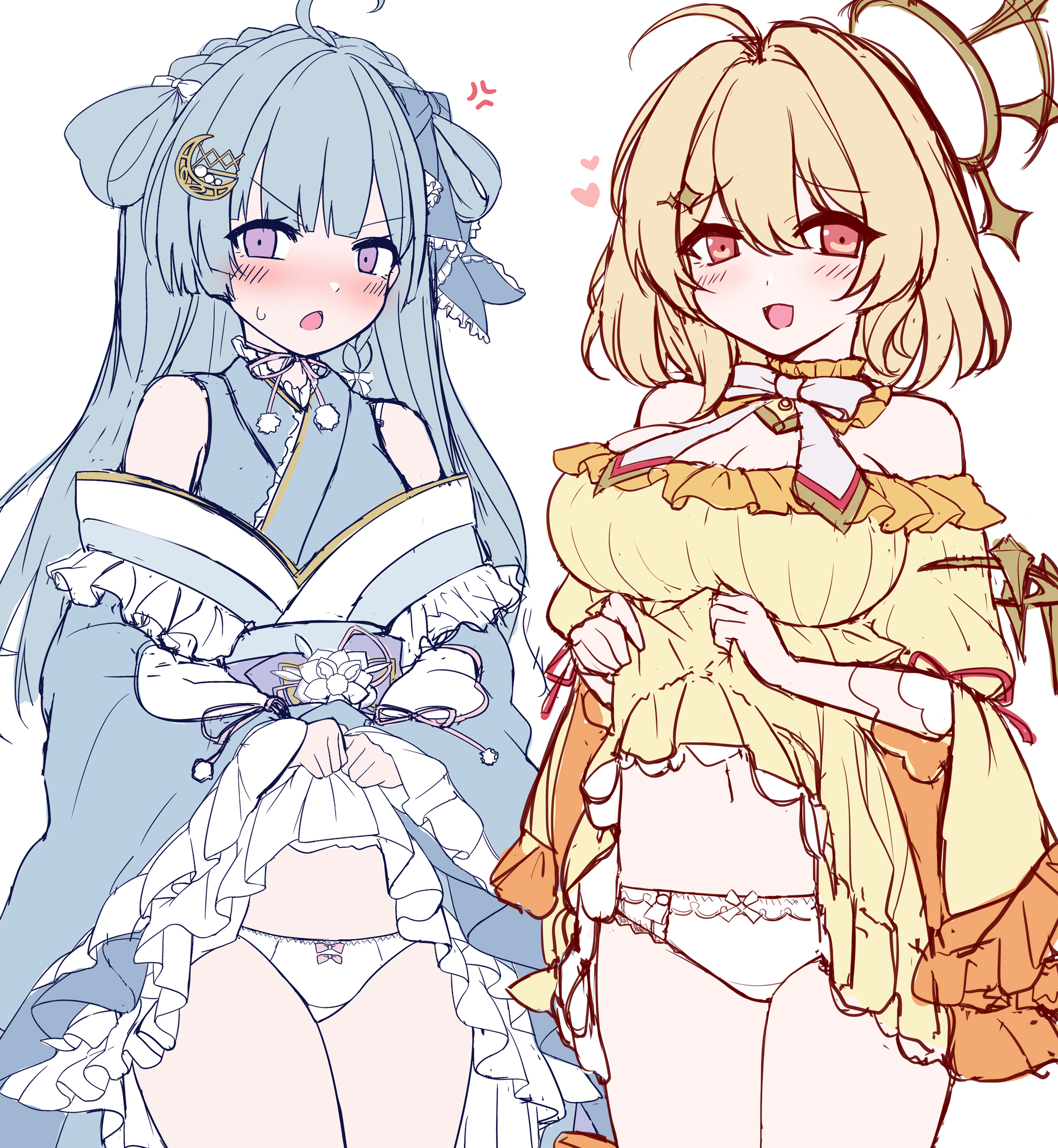 :o2girlsahogebare shouldersblonde hairblue hairblue kimonoblue ribbonblunt bangsblushbowbowtiebraidbreastsclothes liftcollarcowboy shotcrescentcrescent hair ornamentcrescent o-ringcrown braiddressfrilled collarfrilled dressfrilled kimonofrillshair bowhair intakeshair ornamenthaloheartjapanese clotheskimonolarge breastslifting own clotheslong hairlong sleeveslooking at viewermedium hairmultiple girlsobioff shoulderoff-shoulder dressopen mouthorange eyesorange halopantiespink ribbonpurple eyespurple sashribbonsashshyskirtskirt liftsleeve ribbonsmilesweatthighsunderwearvirtual youtuberwhite backgroundwhite bowwhite bowtiewhite pantiesyellow collaryellow dress