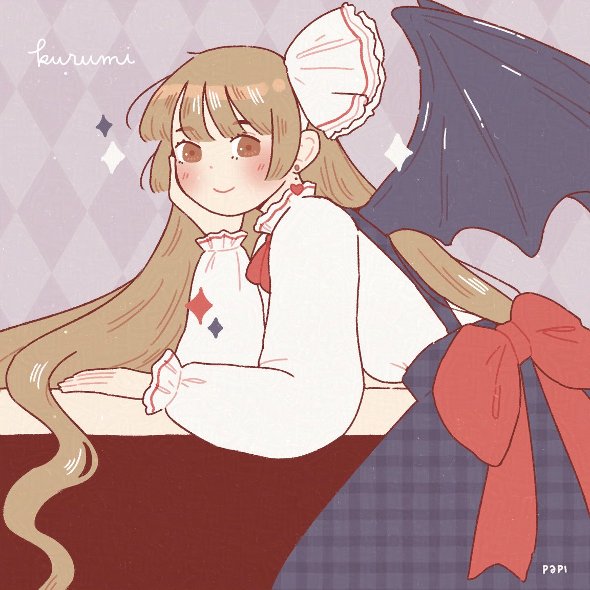 1girlback bowbat wingsblonde hairbowfrillshair ribbonhairbandlong hairlong sleevesribbonshirtskirtsmilesuspendersvery long hairwhite shirtwingsyellow eyes