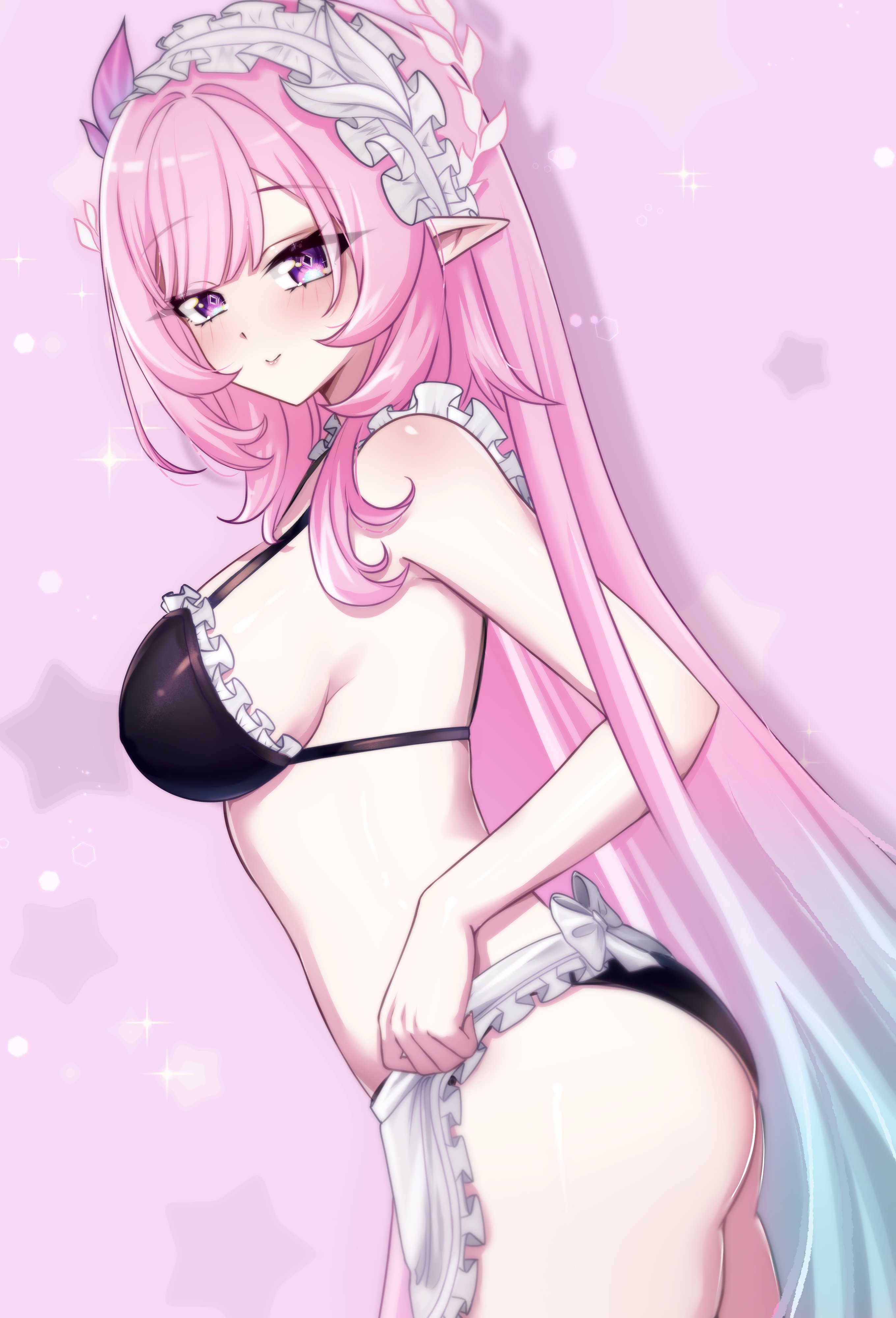 1girlalternate costumeapronbikiniblack bikiniblue hairbreastsdiamond (shape)diamond-shaped pupilsfrom sidelarge breastslong hairlooking at viewermaidmaid apronmaid bikinimaid headdresspink backgroundpink hairpointy earspurple eyessideboobsmilesolostomachswimsuitsymbol-shaped pupilsthighsunconventional maidvery long hairwhite apron