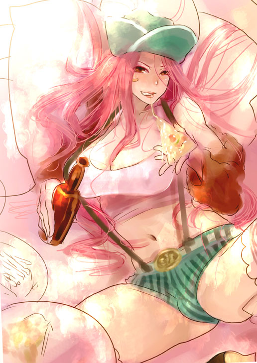 1girlbottlebreastscleavageeatingfemale focusfoodhatlarge breastslong hairpink hairpizzashortssolosuspenders